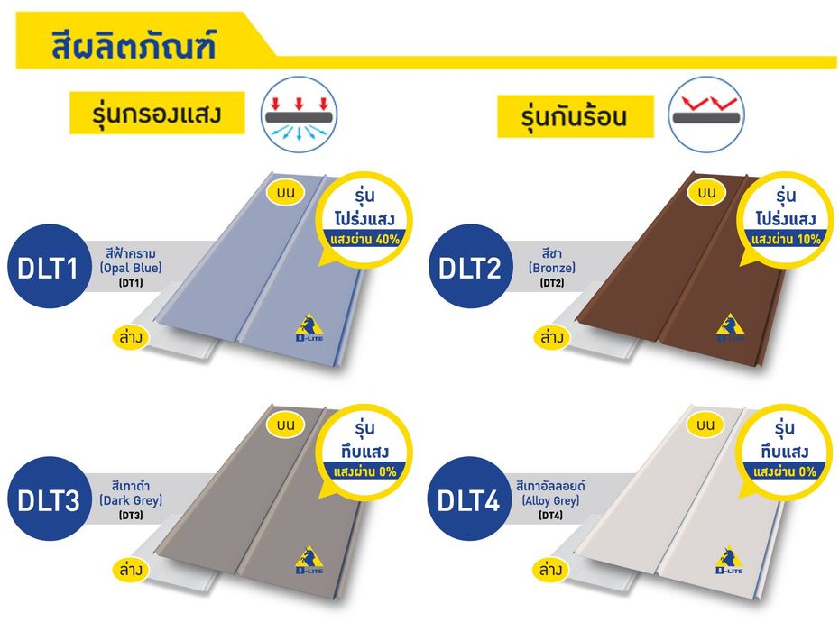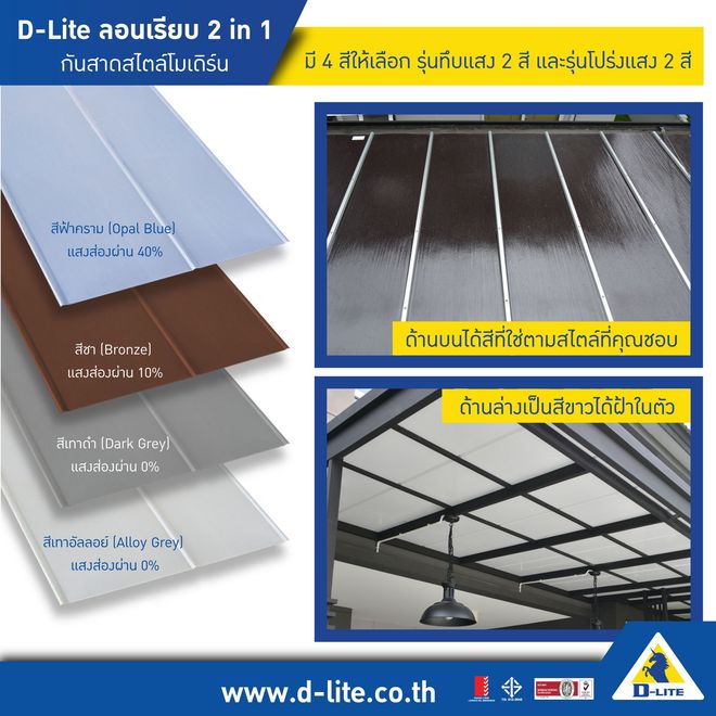 กันสาดดีไลท์ ลอนเรียบ 2 in 1 กันสาดดีไลท์ ลอนเรียบ สไตล์โมเดิร์น มี 2 สีในแผ่น 1 เดียว ด้านบนได้สีที่ใช่ตามสไตล์ที่คุณชอบ ส่วนด้านล่างเป็นสีขาวได้ฝ้าในตัวด้วยนวัตกรรมการเคลือบฟิล์มสีขาวซึ่งเป็นเอกสิทธิ์โดยเฉพาะของกันสาดตราดีไลท์เท่านั้น
